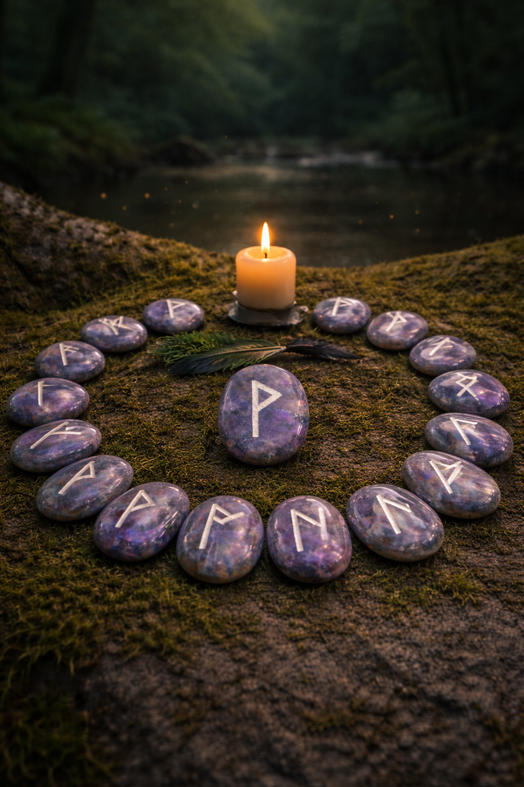 Chaque rune est gravée, polie et purifiée à la main. Chaque pierre est unique et porte son propre éclat violet.
